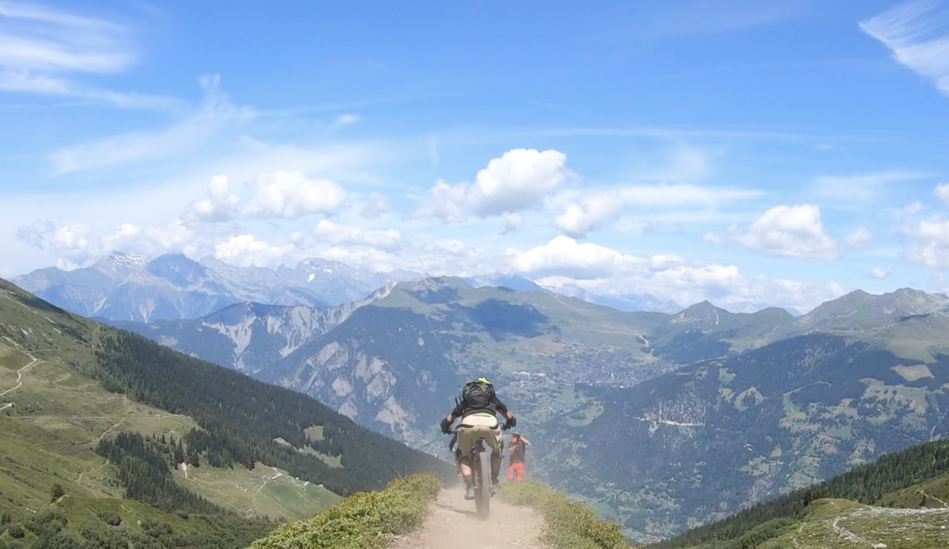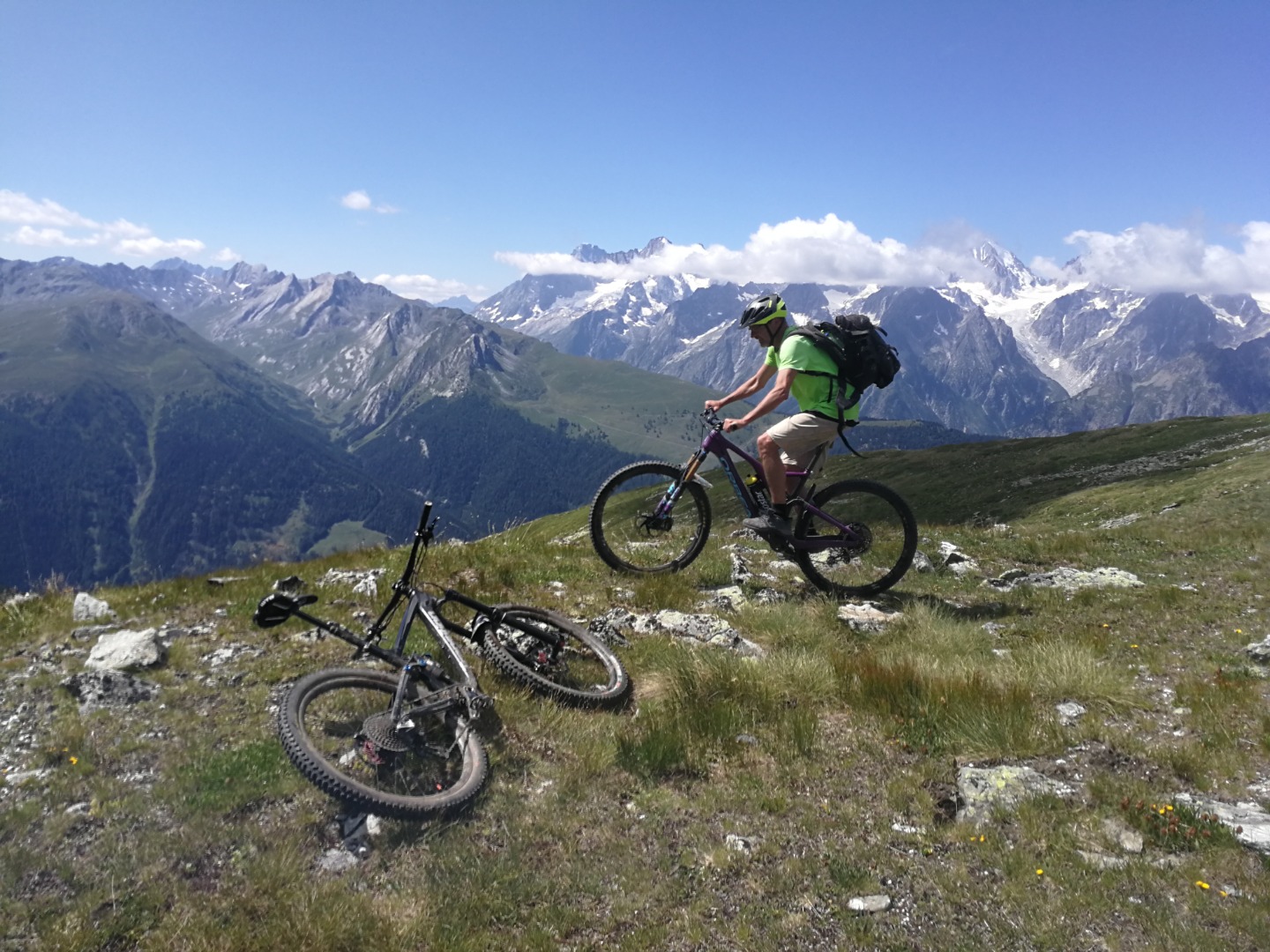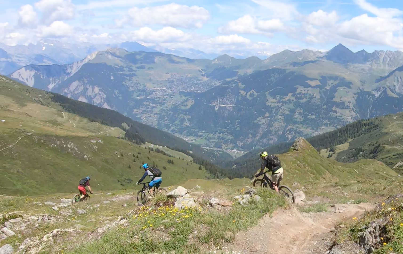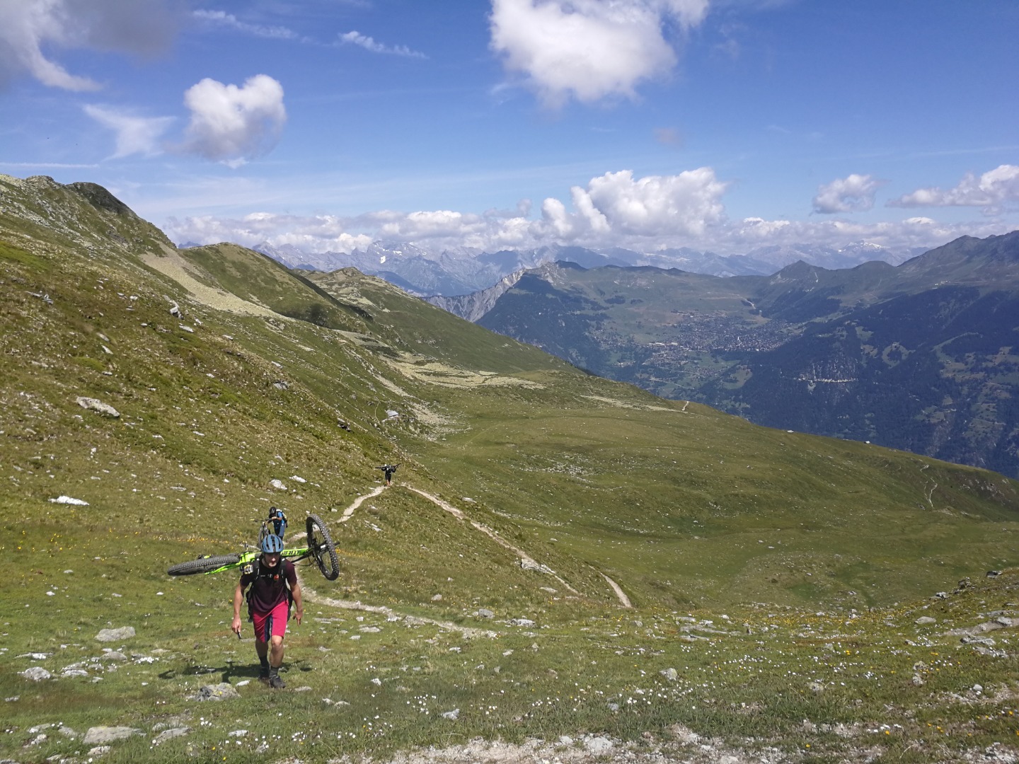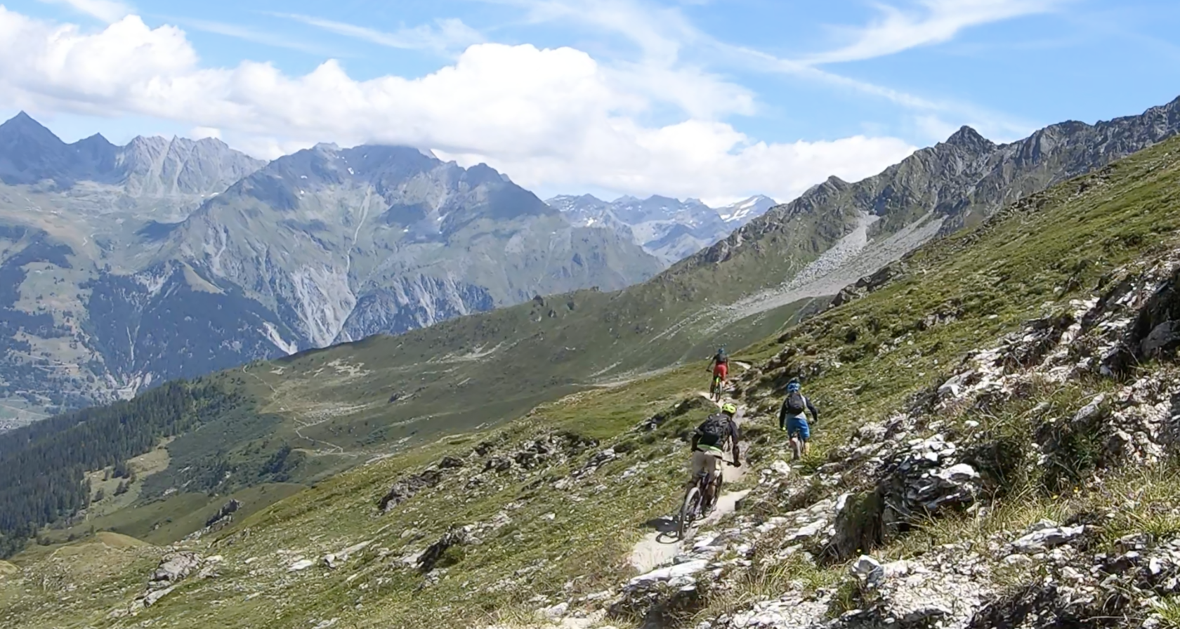 Enchainé avec : nuit à la cabane du Mont Fort – traversé très matinale du balcon en dessus de Verbier sur le super flow trail jusqu’au Chute du B. Descente 4 casques sur Cries.