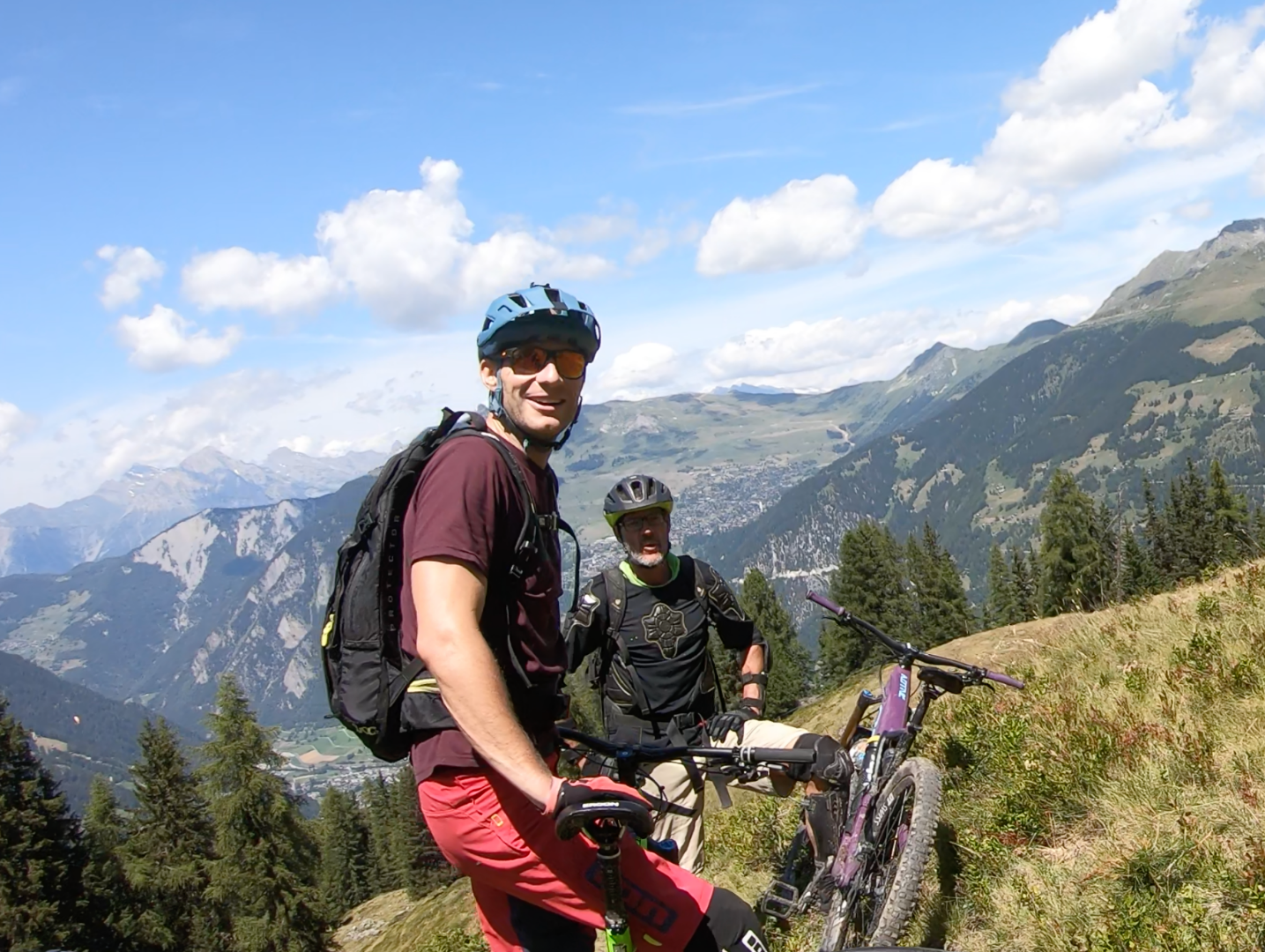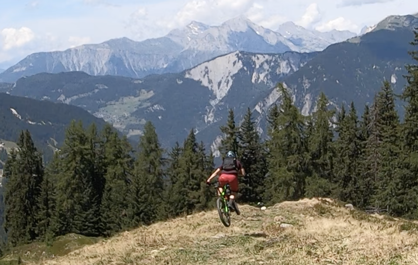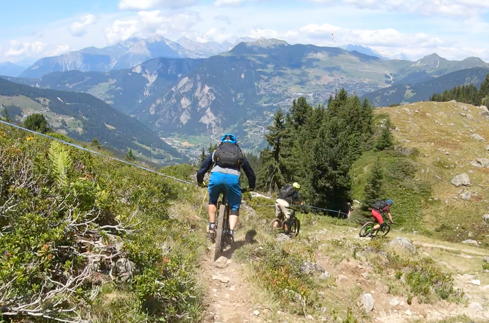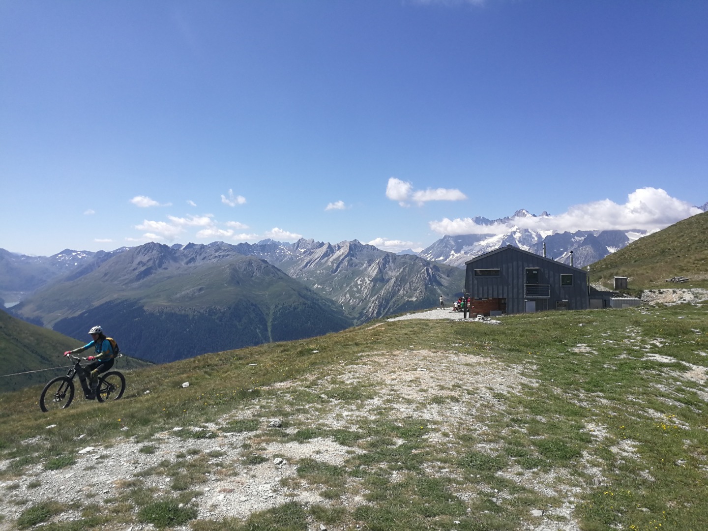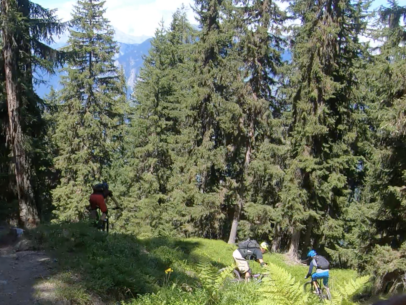 Enchainé avec : nuit à la cabane du Mont Fort – traversé très matinale du balcon en dessus de Verbier sur le super flow trail jusqu’au Chute du B. Descente 4 casques sur Cries.