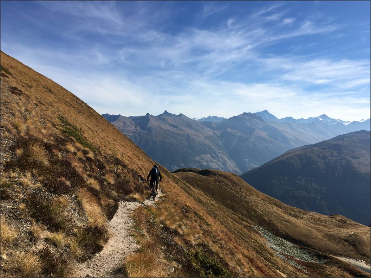 La descente débute par le magnifique chemin de crêtes entre le Mont Rouge et le Mont Carré puis par un joli sentier de montagne jusqu’au pied du Mont Côille. Ensuite, un petit bout de piste pour rejoindre la cabane d'Essertze. De la cabane, un single juste magique nous amène à la route menant au barrage de la Grande Dixence.