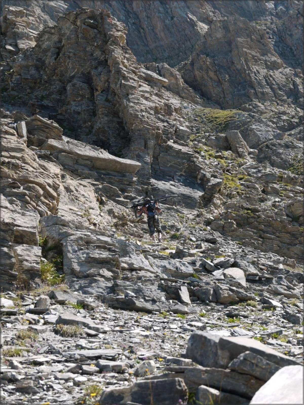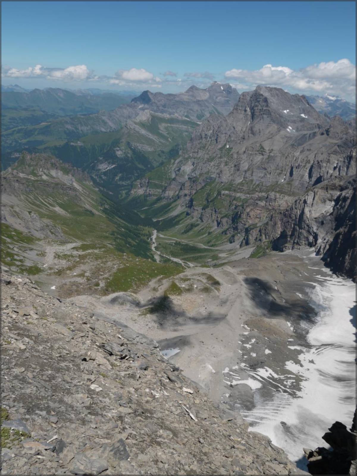 De là commence la descente jusqu'à la Cabane de Fenestral. Cette descente est du pur Freeride à travers dalles, éboulements et névés. Aucun sentier n'est tracé. De plus, certains passages ne peuvent se faire qu'à pied et se rapprochent plus de la 'déséscalade' que de la marche. A nouveau, un minimum de 3 personnes est nécessaire pour les passer sans encombres.