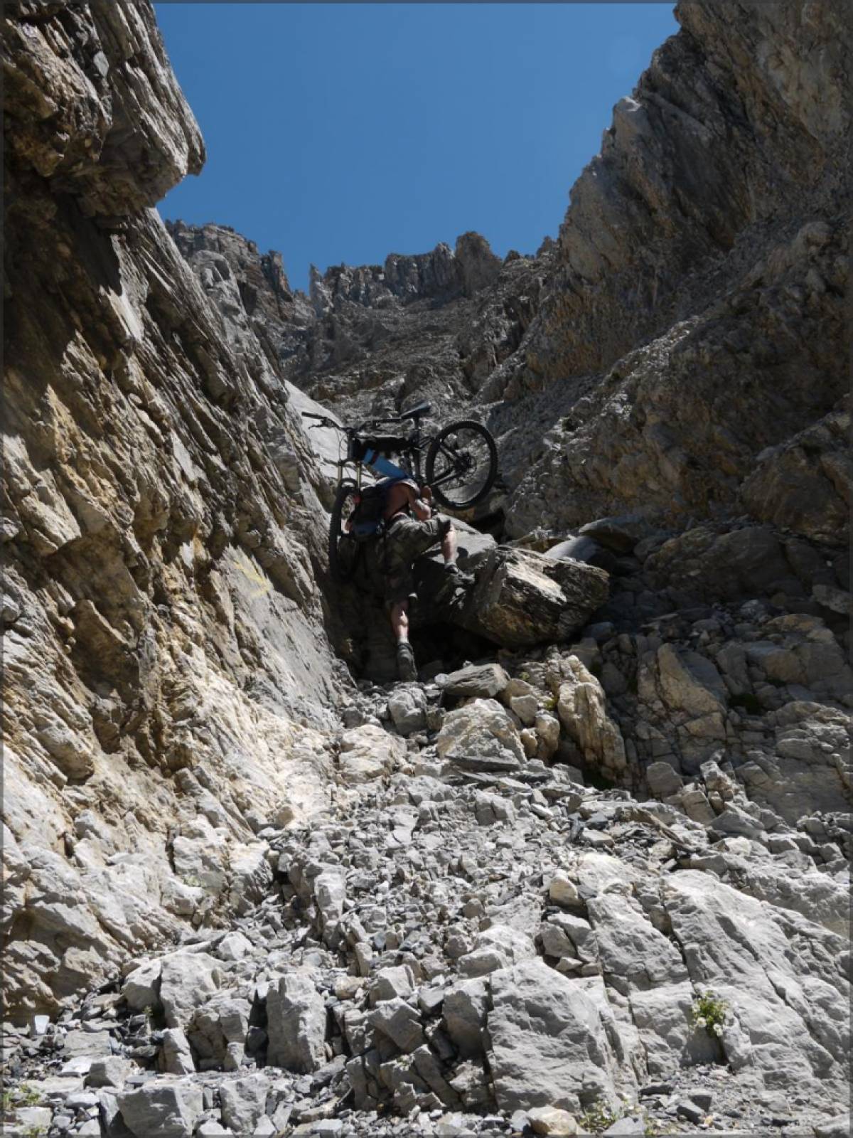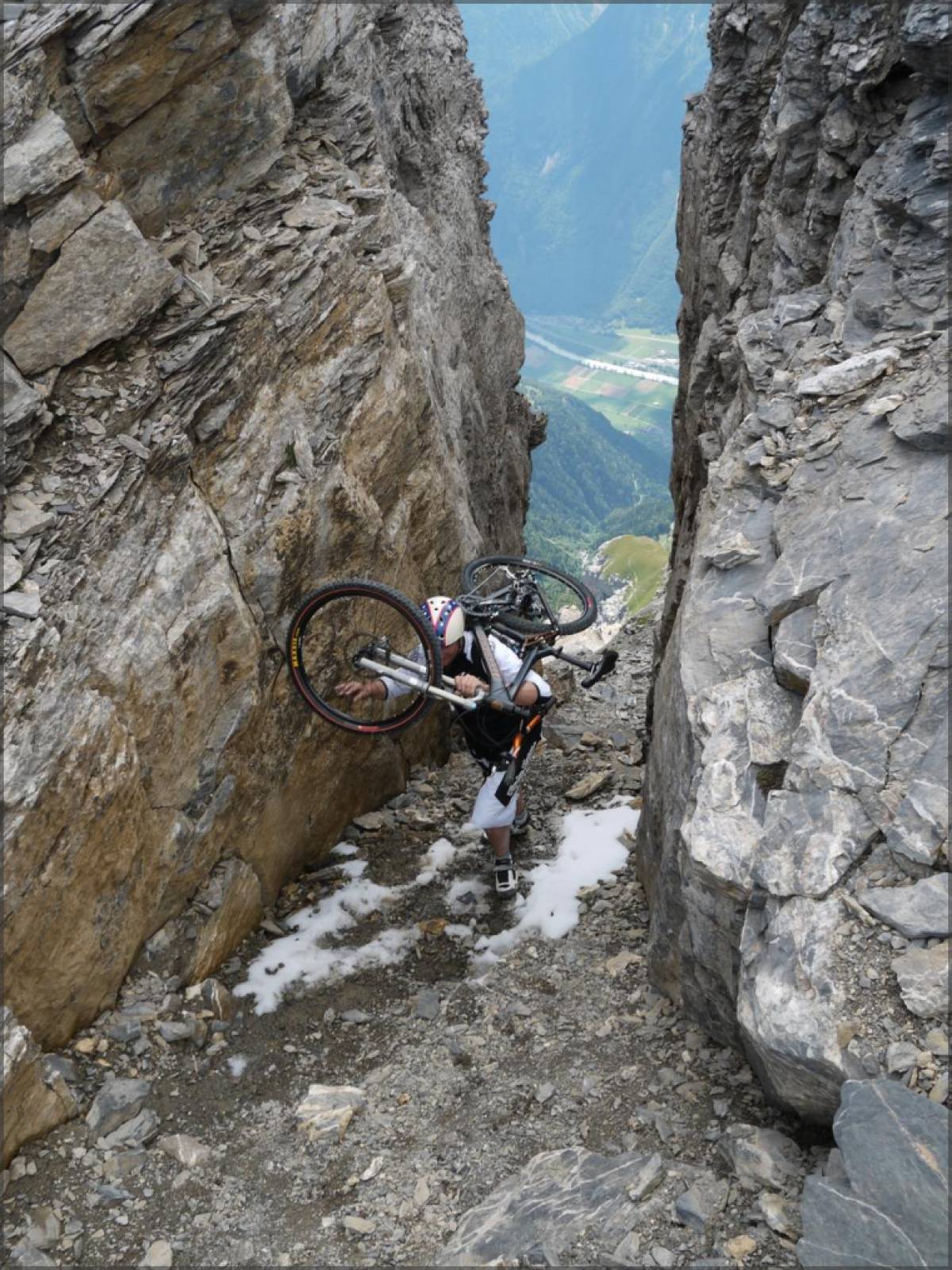 Au départ du parking de la Tourche, on commence par une montée régulière jusqu'à Riondaz, comptez environ 1h de pédalage. De là, on commence la marche d'approche pour atteindre le sommet de la Dent de Morcles. Ce portage dure au minimum 3h, il est exténuant, très dangereux et il est impossible de rebrousser chemin une fois commencé! Une cheminée et un long goulet se trouvent le long du portage et demandent les efforts conjoints de 3 personnes pour passer sans encombre.