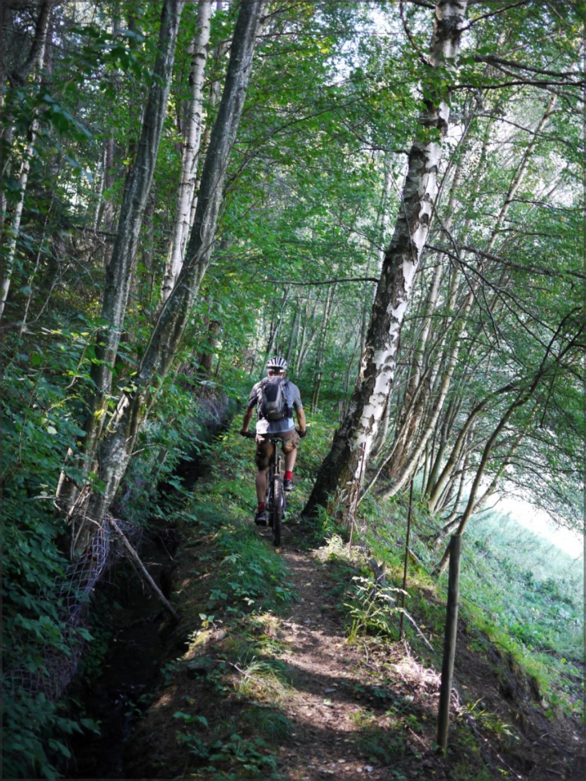 De Griebjini Oberstafil, on attaque alors la descente jusqu'en plaine. Jusqu'à Oberems, c'est un superbe sentier qui serpente dans une forêt de mélèzes. Petits sauts, virages relevés, pâturages qu'on croirait passés à la tondeuse...bref, une véritable carte postale.