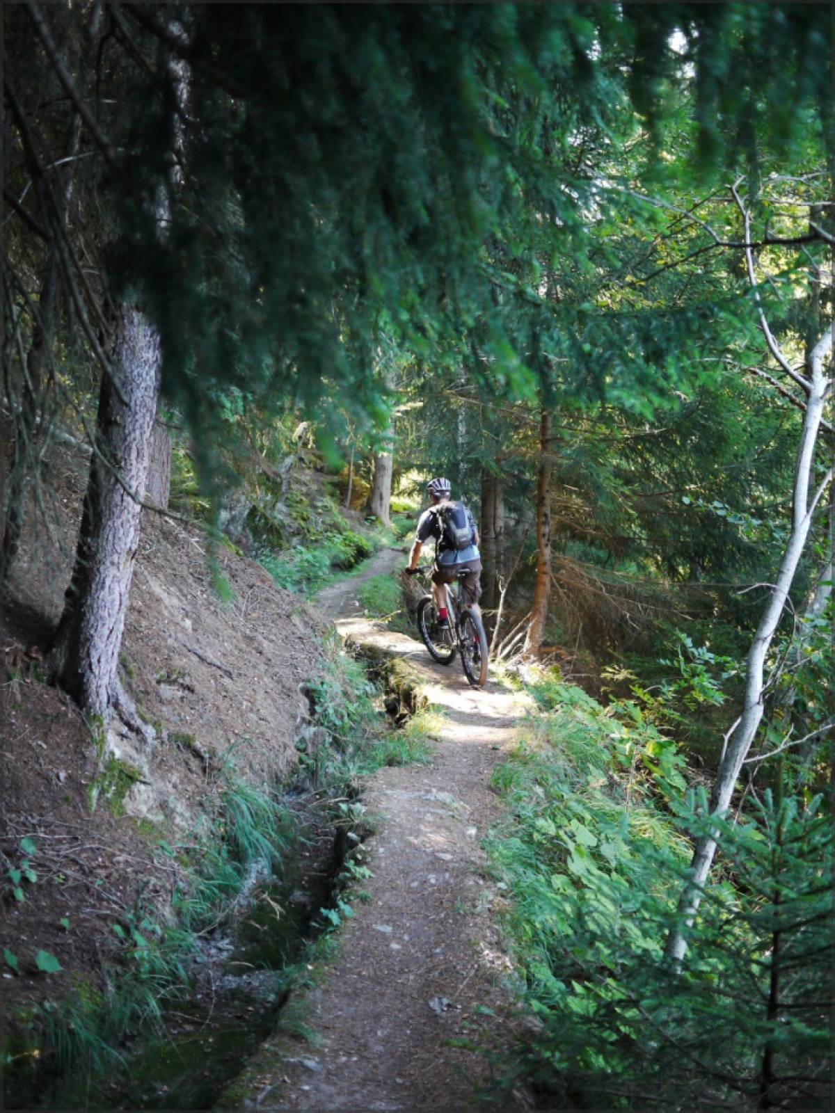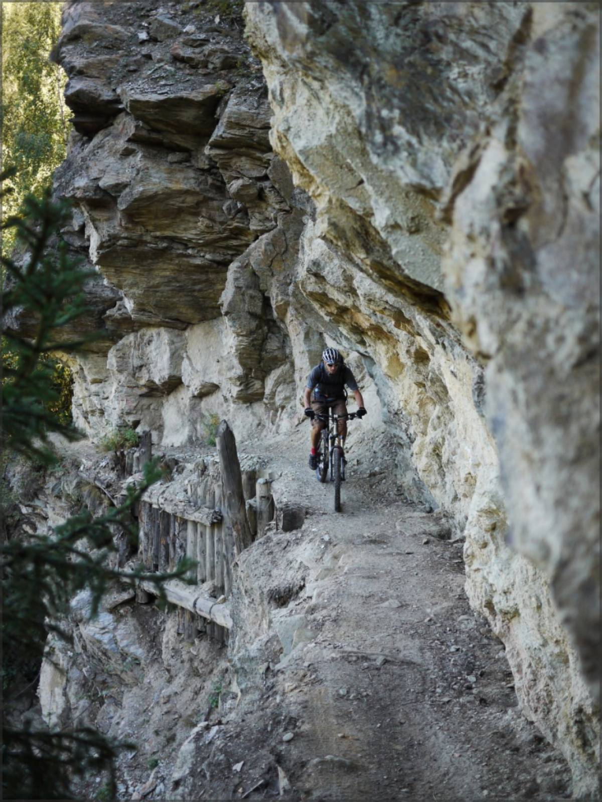 On suit ce sentier de bisse jusqu'au-dessus du point 1140 où une courte poussette permet d'atteindre le bisse d'Ergisch. Celui-ci est à 90-95% roulable, et ne présente aucune difficulté technique. Par-contre, l'étroitesse du sentier et la présence d'à-pics et de falaises pimentent son parcours...évitez de tomber...