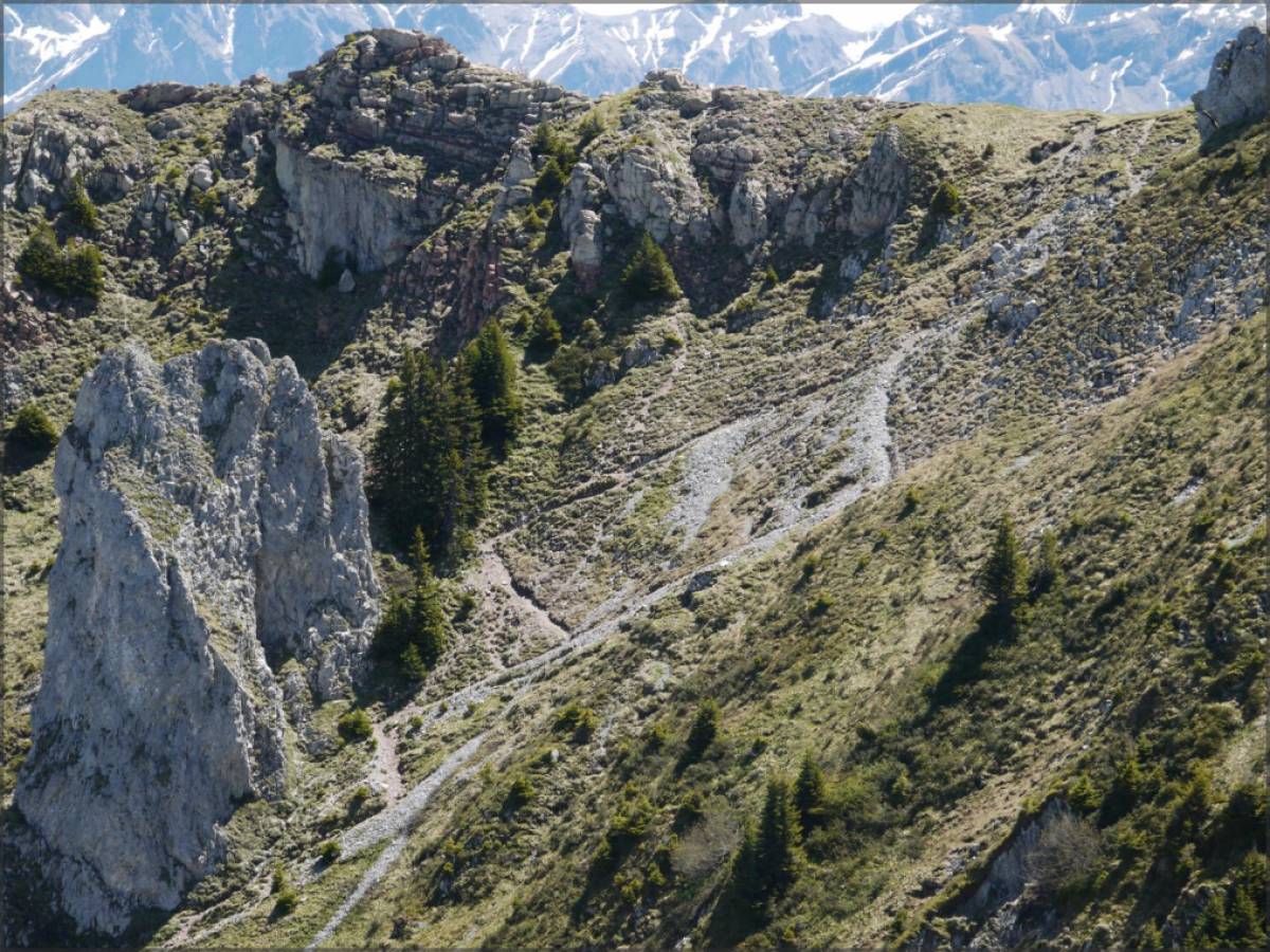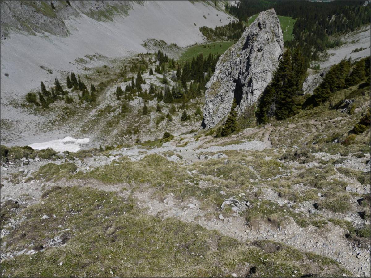 La descente suit le sentier qui part quelques mètres à l'est de la croix sommitale, les premiers lacets sont vertigineux et très exposés, on ne s'y lance pas à la légère. En cas de doute, mieux vaut rebrousser chemin...