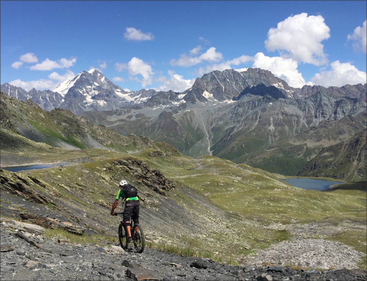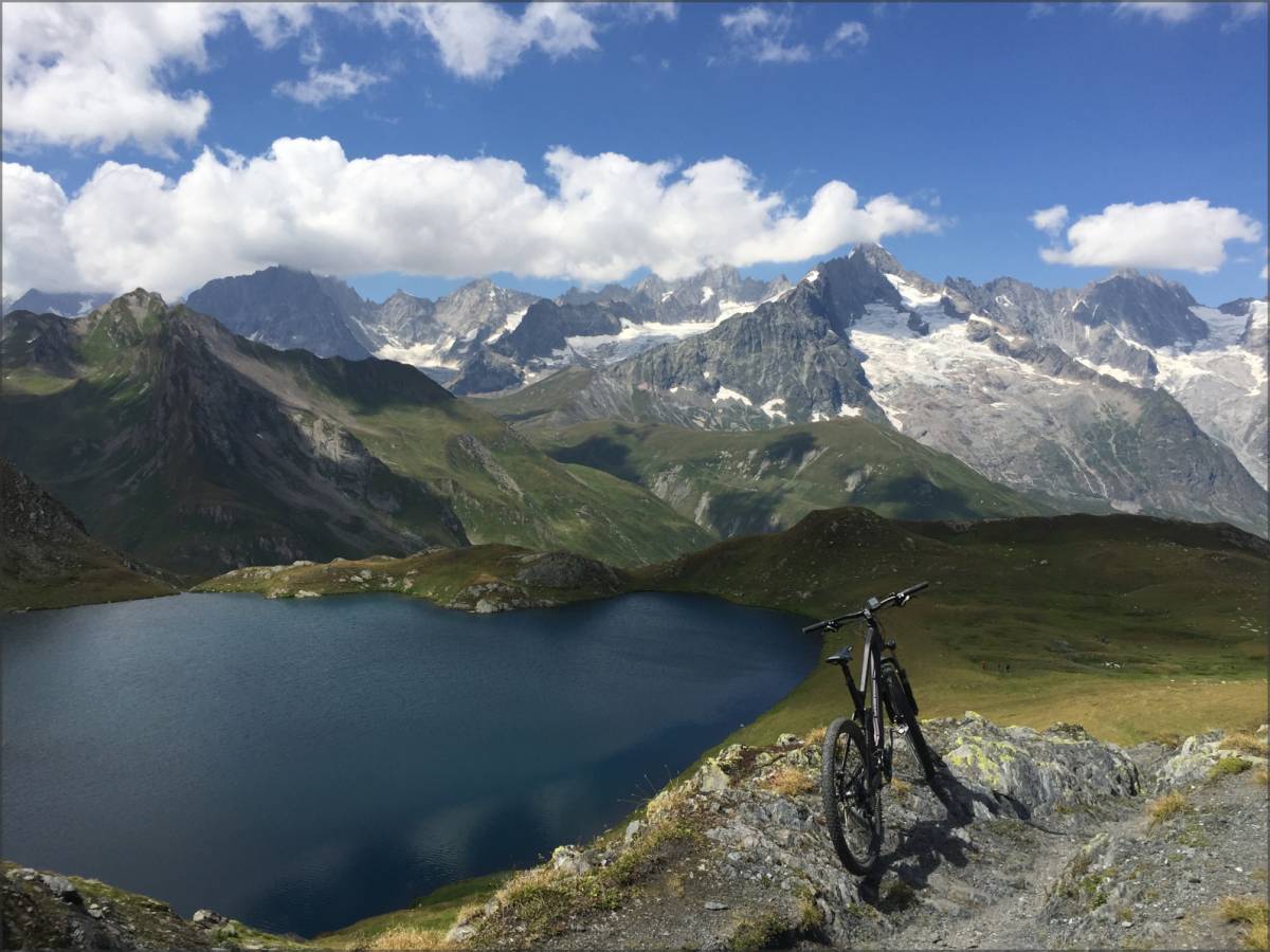 Suit la première belle descente sur les lacs des Fenêtre , environ 250m de D- avec des passages bien roulants et en toile de fond le massif du Mt Blanc. Du pur bonheur !